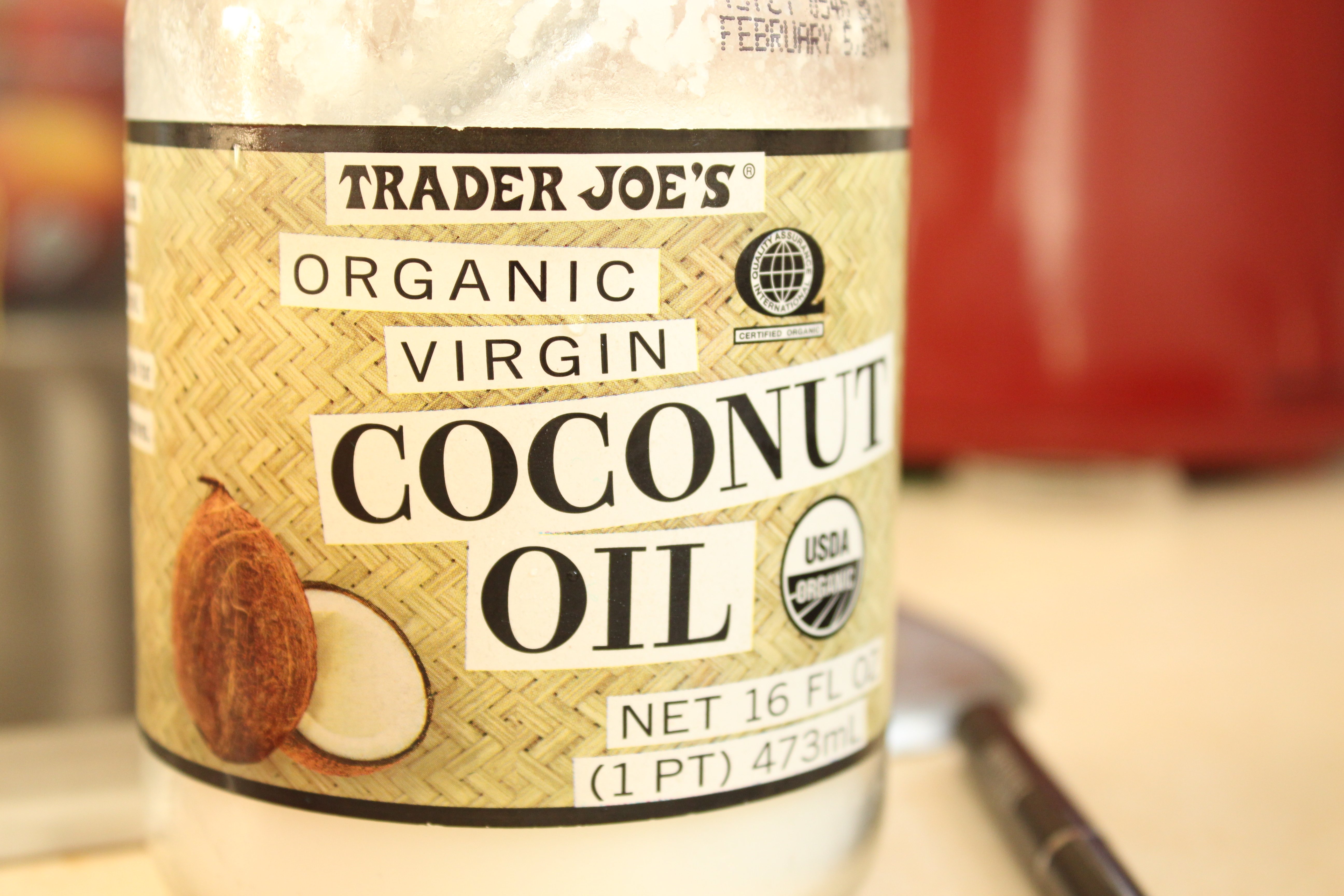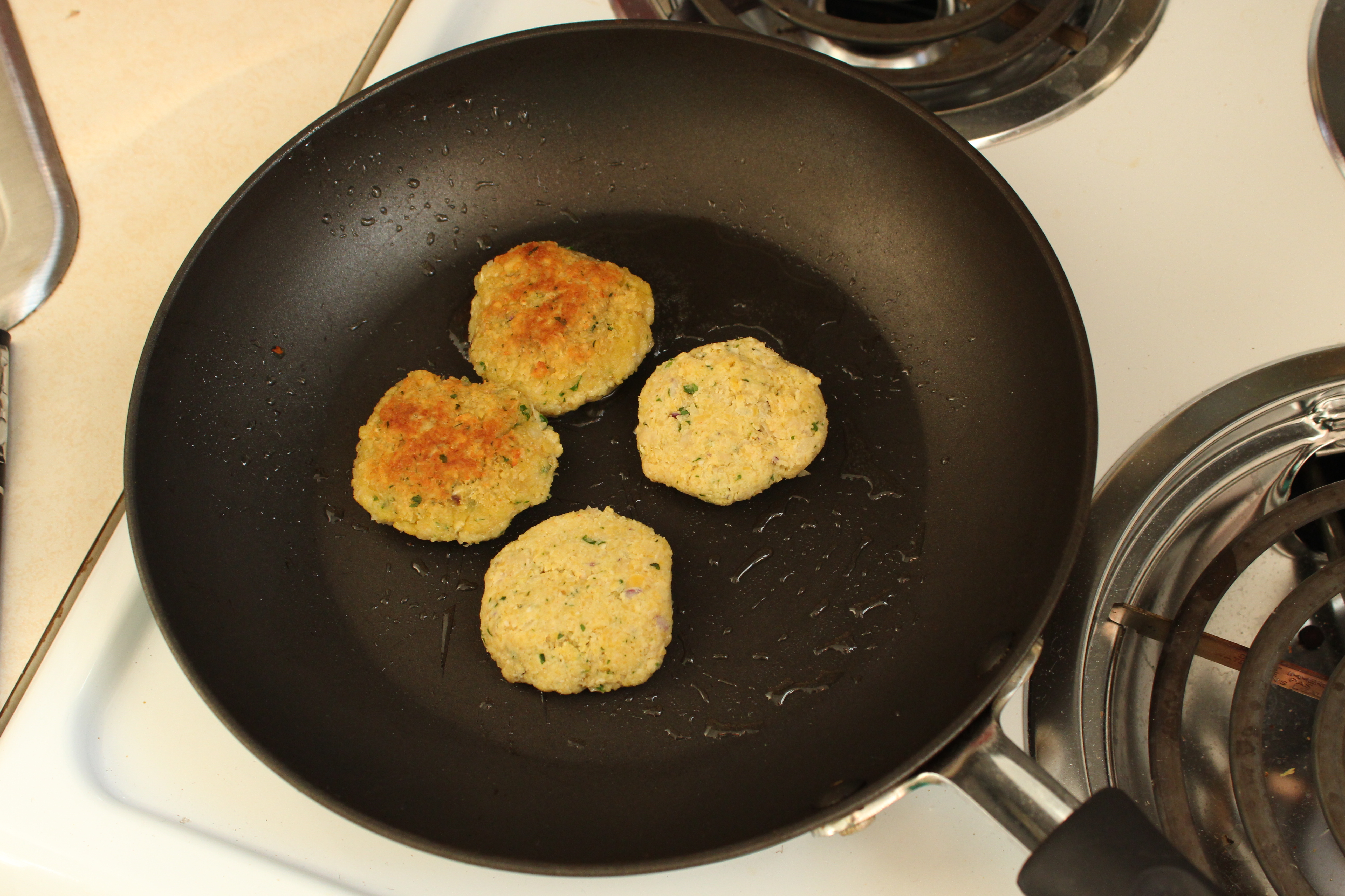 Heat a small pan or skillet to medium and put half your oil in the pan. I preferred to use coconut oil in this case because coconut oil is solid at room temperature and is good to cook with at high heat. This leads me to using less of it to fry the falafels – which is inherently (at least in my mind) more healthy. I got mine at TJ’s a while ago and it’s still going strong. I dug it out with a spoon and added to the pan to melt it down. You could also give the jar a quick microwave to soften it up for easier handling.