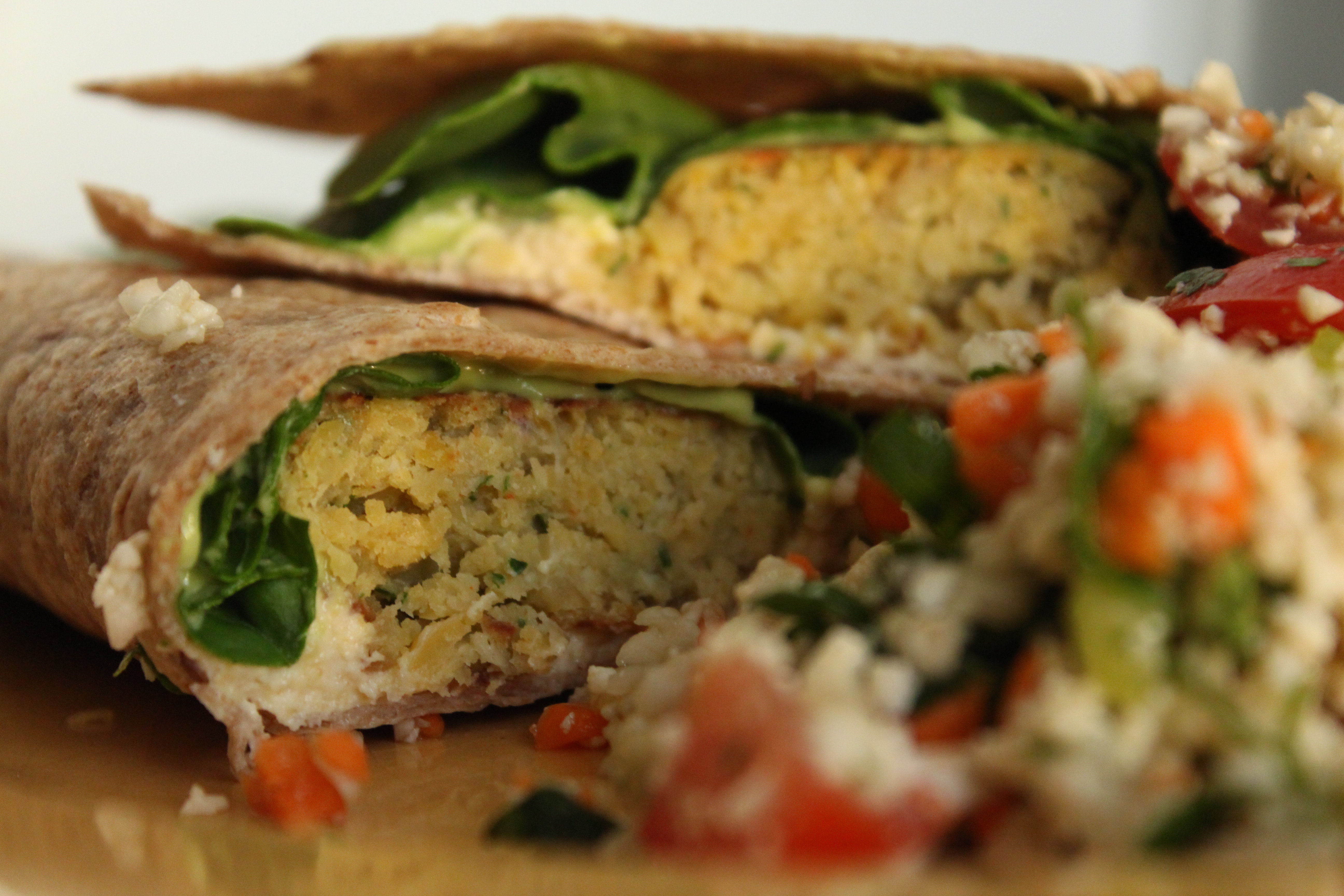 Spread a generous amount of hummus on a whole wheat wrap (or spinach for you non-gluten kids out there). Add your falafels and a handful of spinach. Put a dollop of avocado sauce on top and roll up.