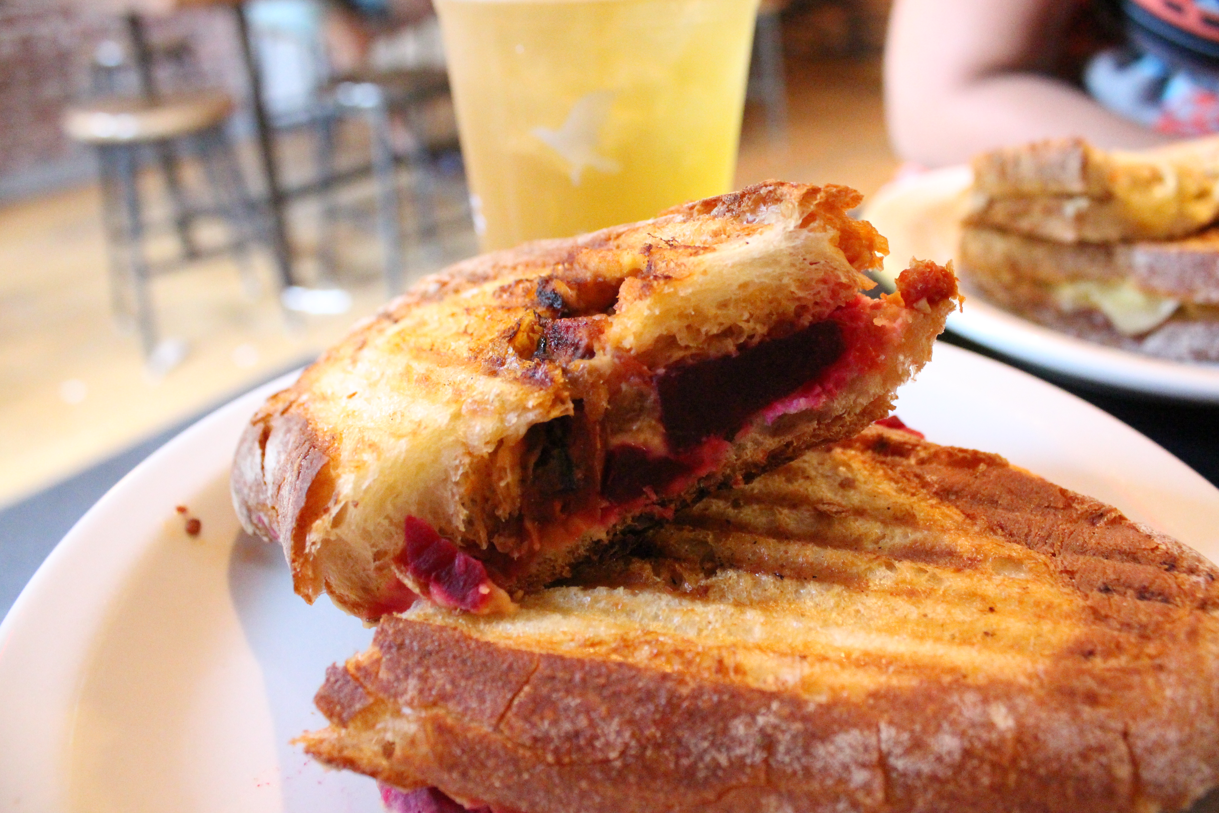 Alas, I digress. This lunch catch-up was not a time for bagels. This was a time for a sandwich. There was one I was particularly drawn to – the feta sandwich with roasted tomatoes and beets served pressed on a hearty ciabatta that’s pressed and served warm. But of course the feta was not going to fly. So after thoroughly confusing the cashier by ordering the “feta sandwich without feta but can you add hummus?” I was left with this little gem. It was delicious if I do say so myself! (and they didn’t even mess up the order!)