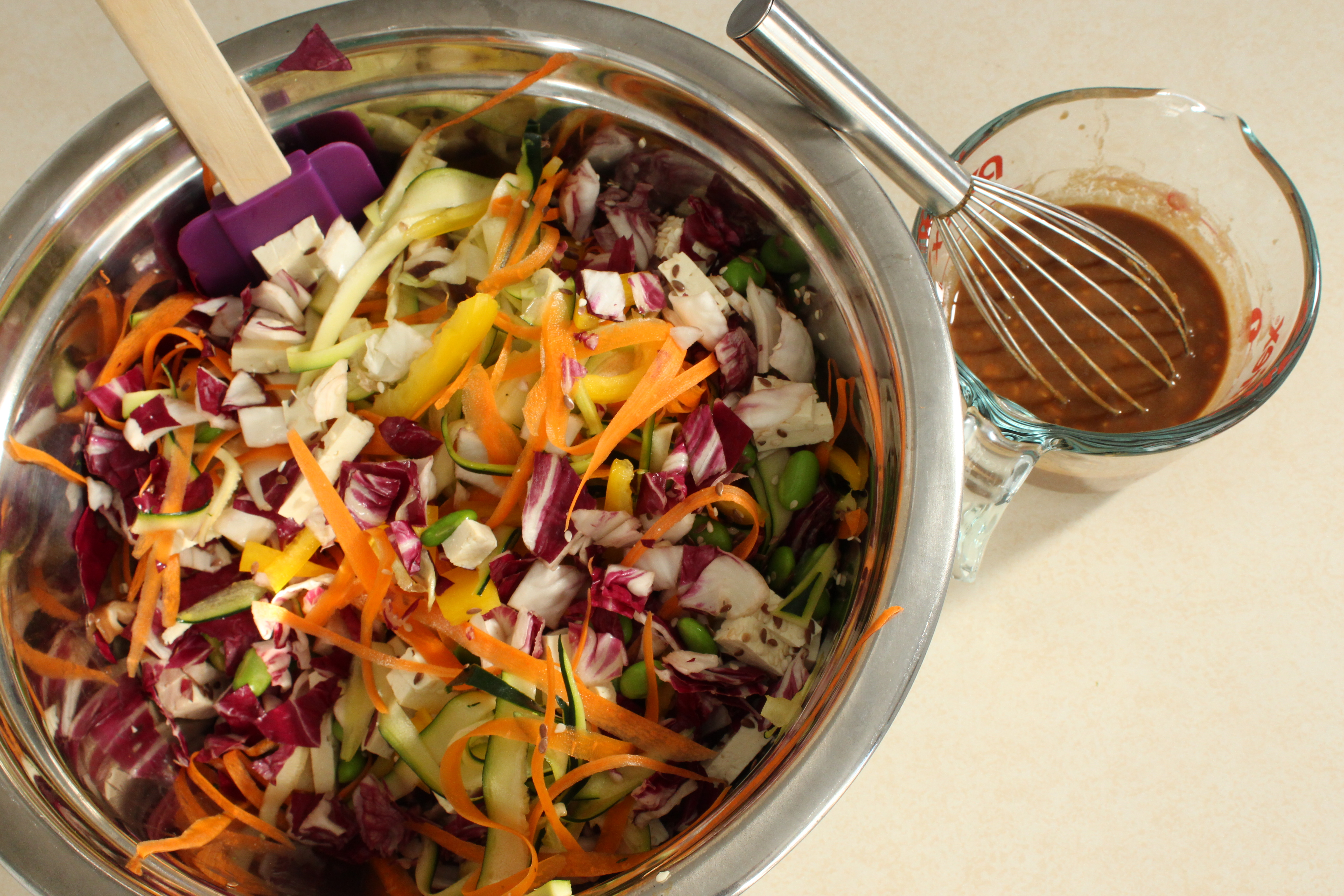 Toss all the veggies together in a giant bowl and make your dressing in a separate container. I chose to keep the dressing separate until each serving was ready to eat.