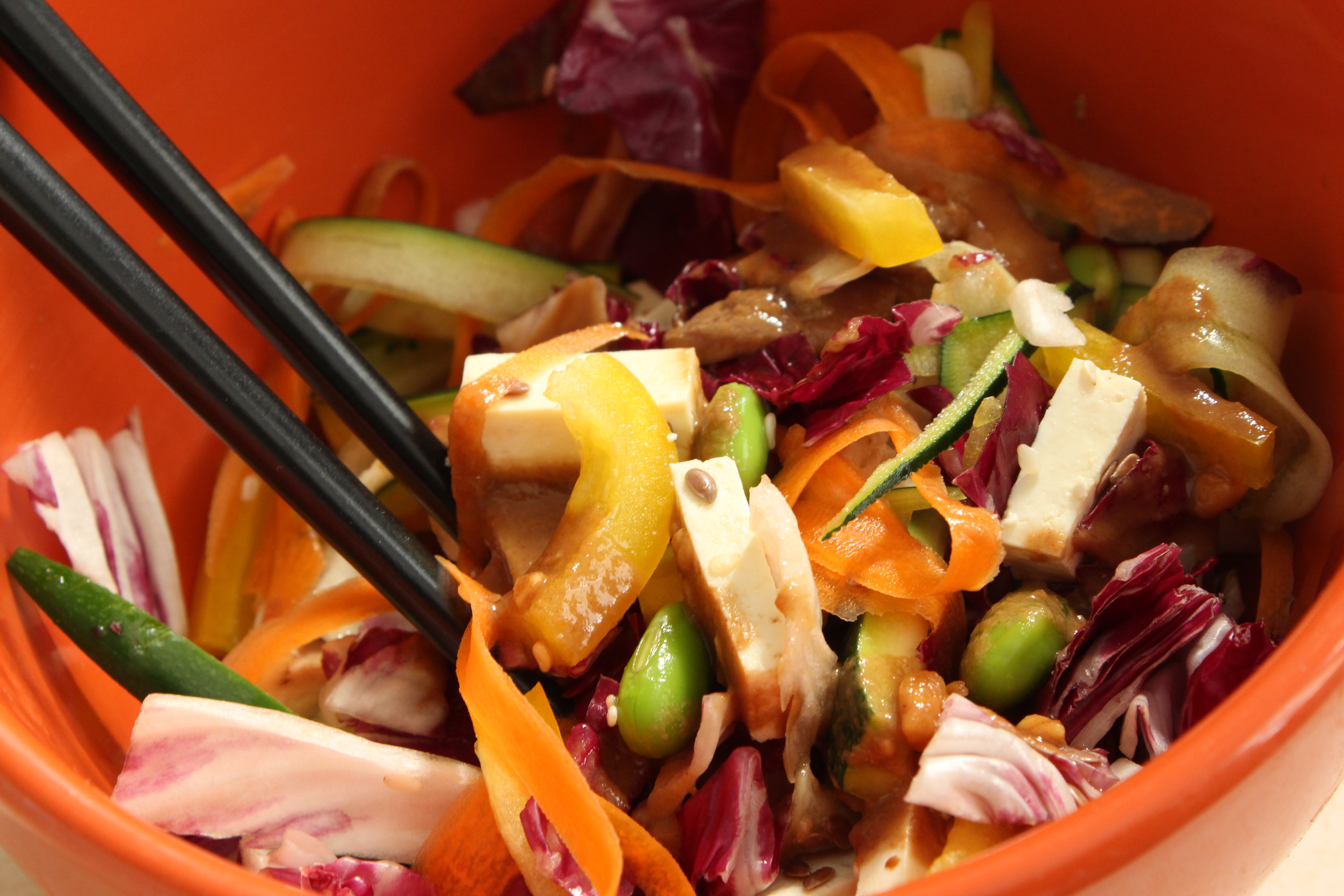 Get your tofu rinsed and pressed first while you work on everything else. Saute your mushrooms in sesame oil until they release their juices – set aside. Chop all of your veggies and try not to lose a finger. I decided to take a veggie peeler to the zucchini and carrots to make the “noodles” but did risk losing if not a finger, at least a nail in the batch. Thankfully, I survived.