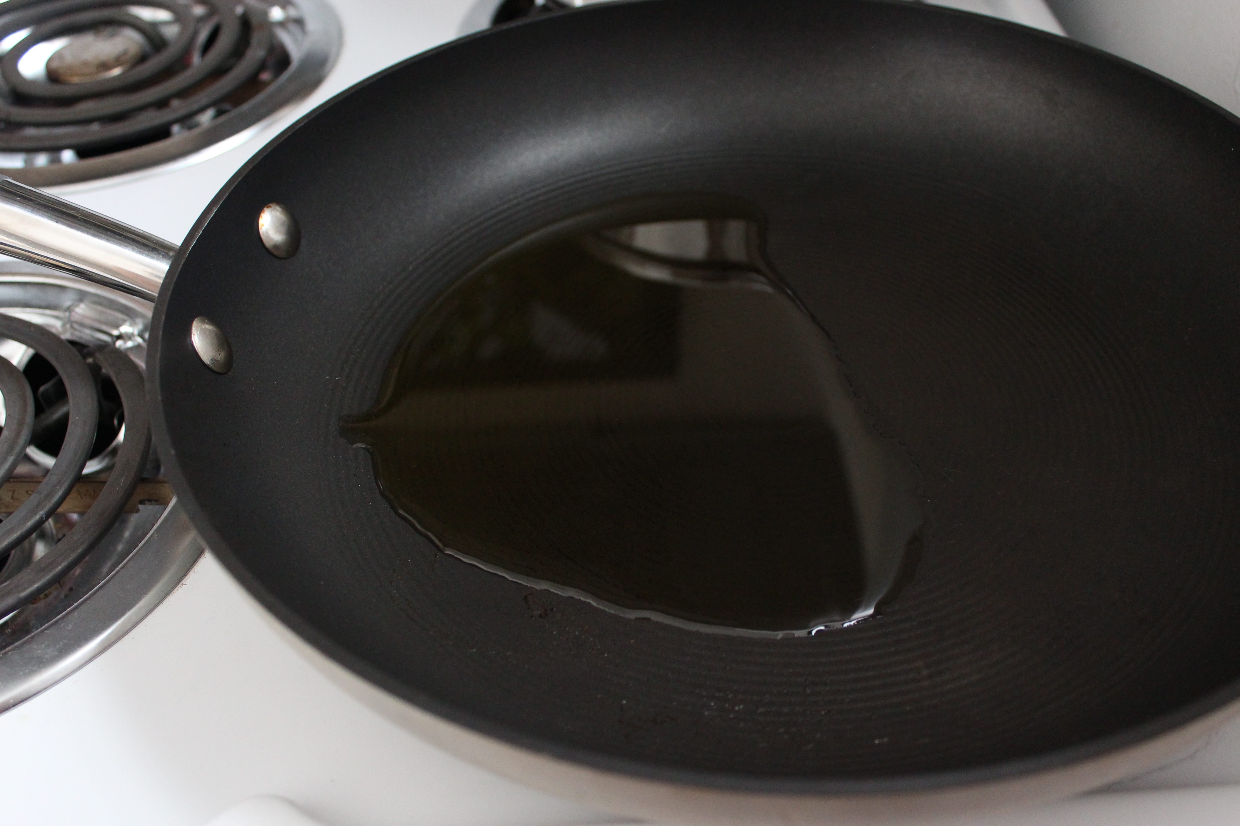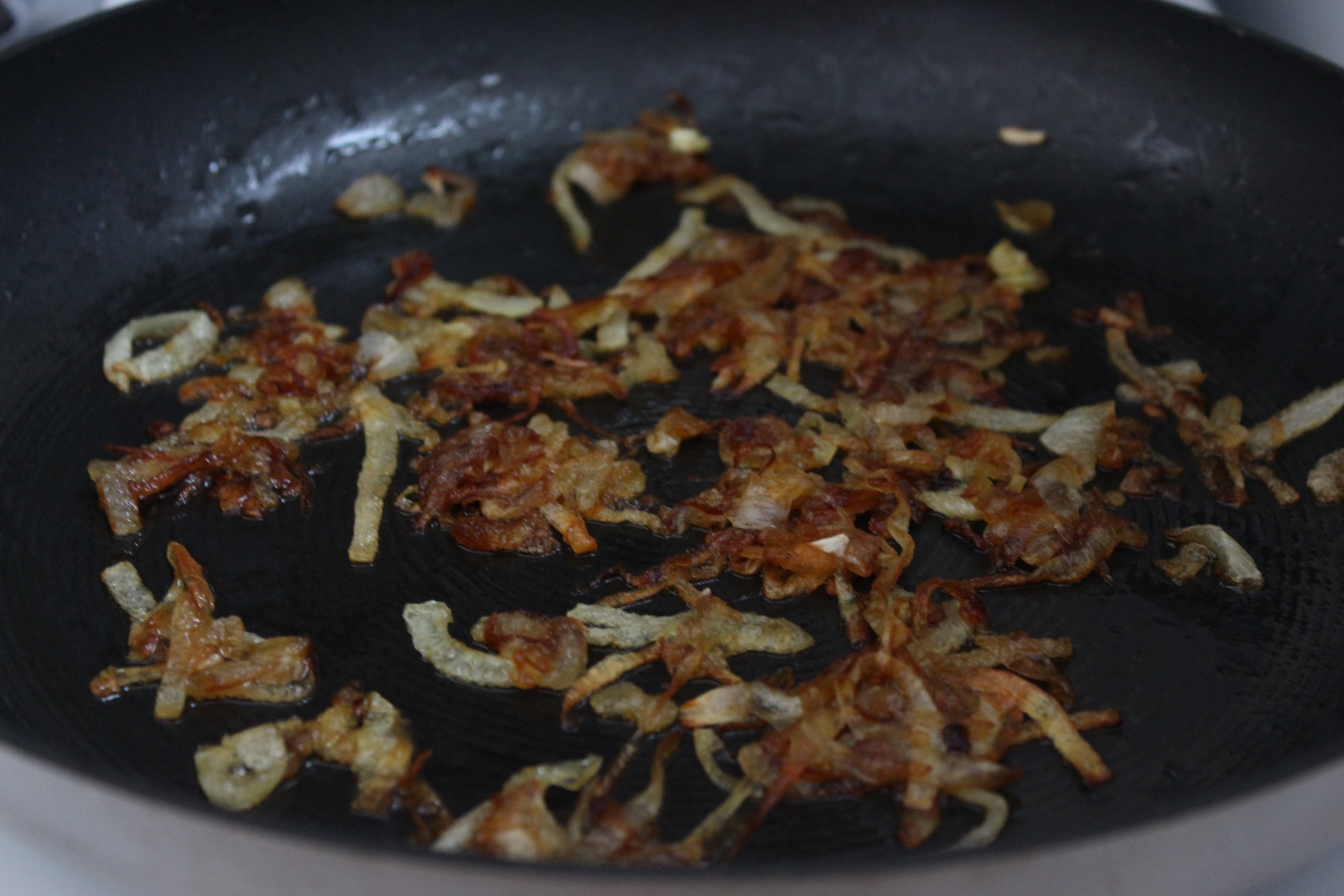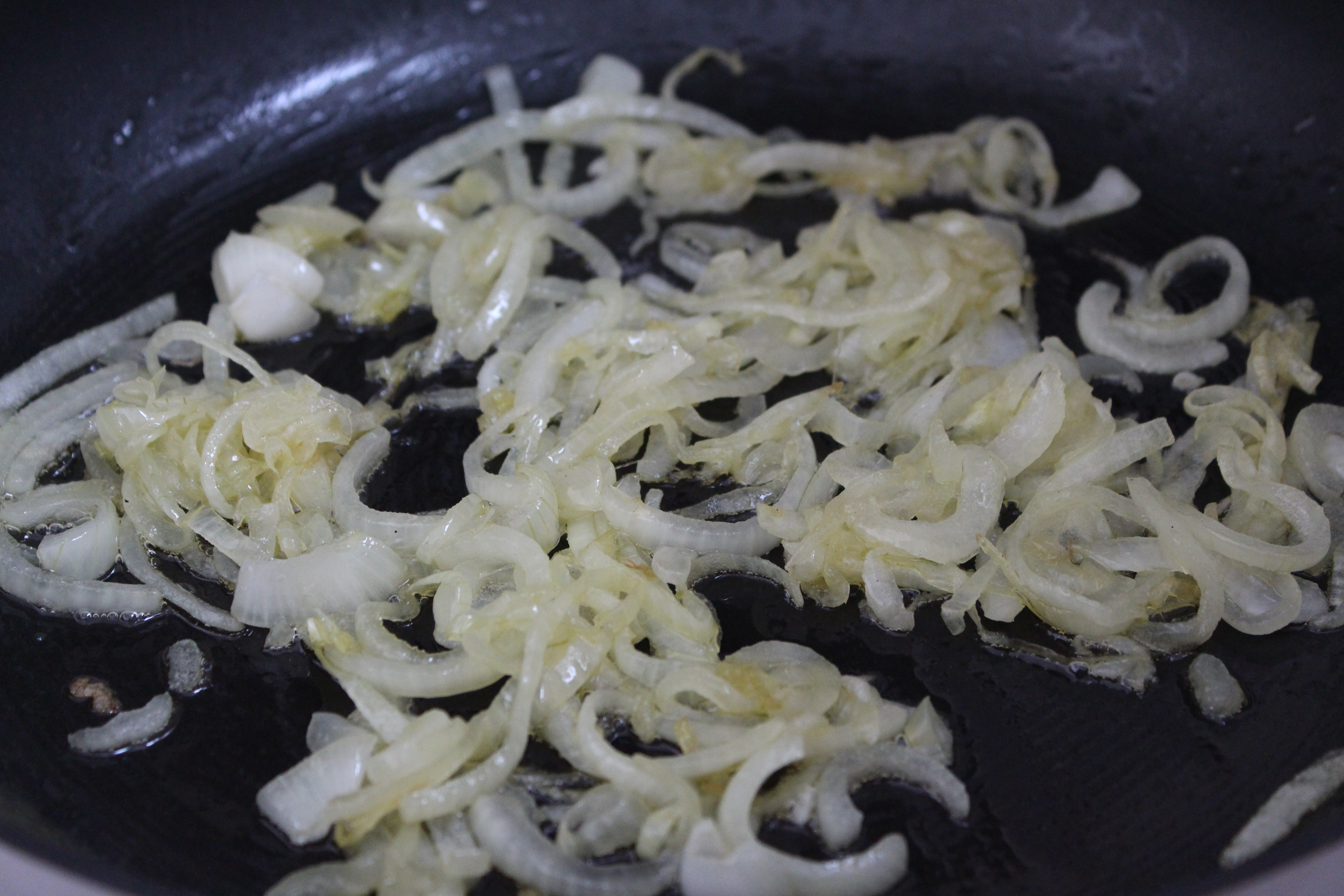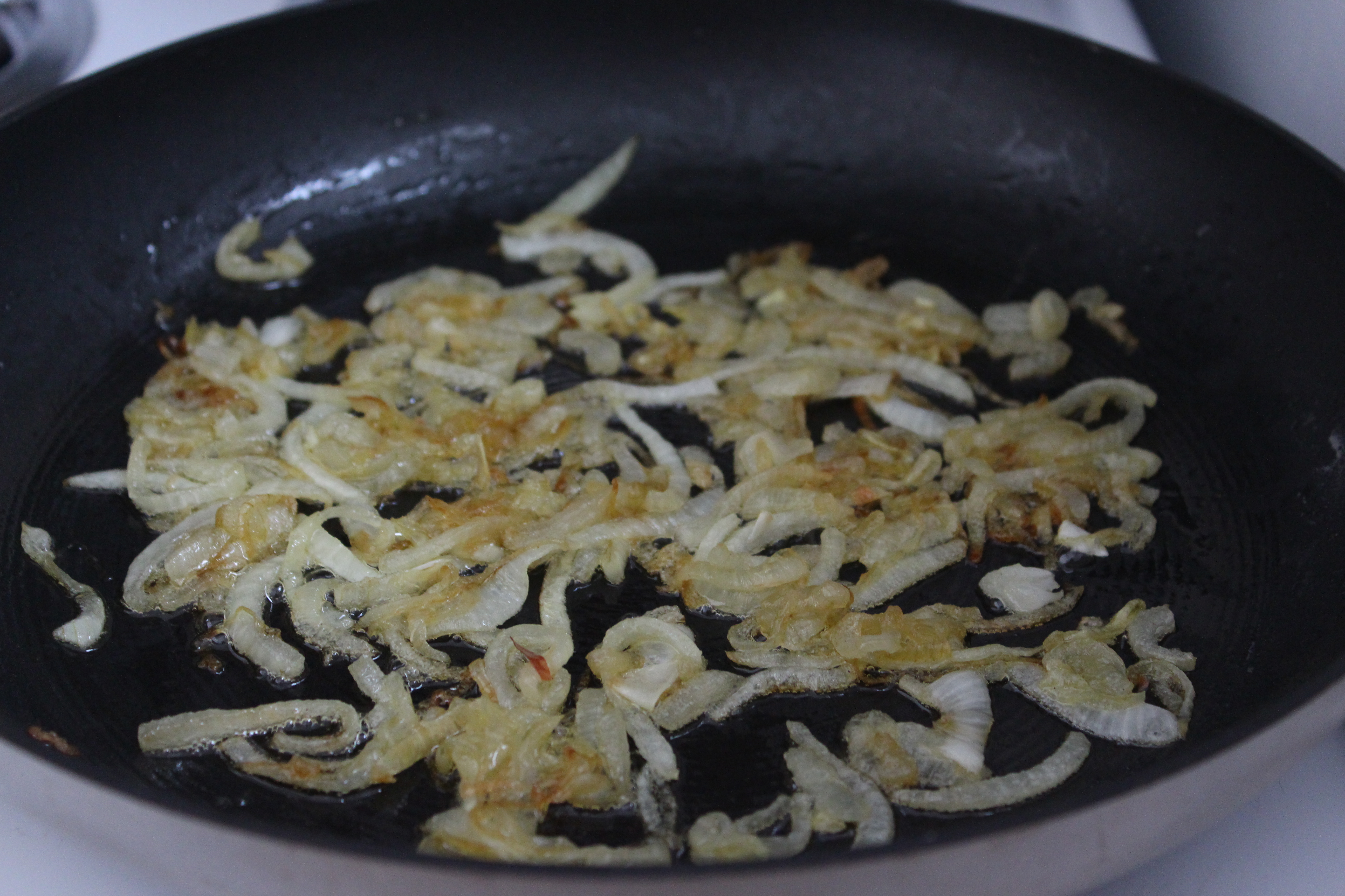I used 2 and a half smallish onions and 2 TBS olive oil and tossed everything in a skillet on low heat. I got up from the TV about every 5 minutes or so to stir them up to ensure an even cooking.