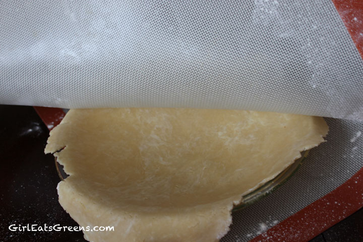 However you arrive at the ball of dough – make sure you use a lot of flour on your pin and surface to ease the rolling process. I really like using a rubber pastry sheet I picked up a few years back. It allows you to flip the crust over into the plate – which makes everything so much easier!