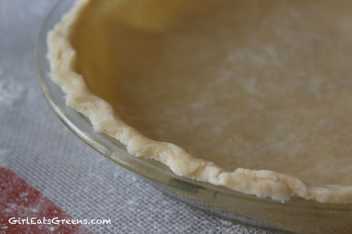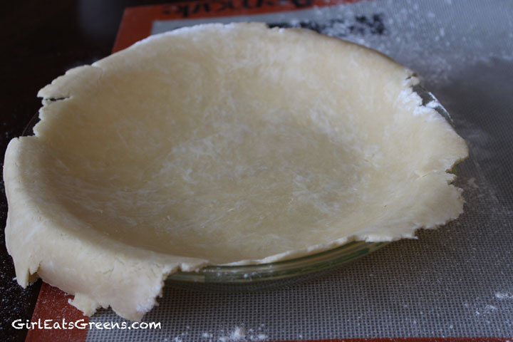 You can do a bit of prettying up after the crust is in the pan – to trim anything that’s laying over the edge and add to sections that may be missing (use a bit of water to attach extra pieces). Pinch the edges to give the crust a pretty trim.