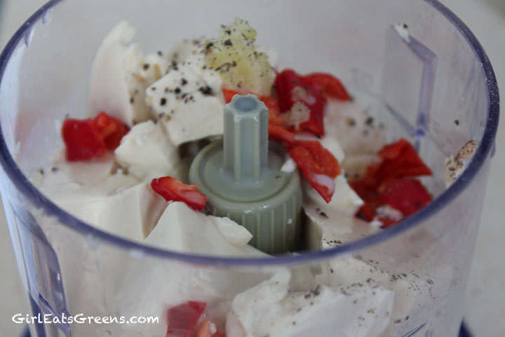 Next, start on the insides. Chop all your veggies up and then add the tofu, milk, garlic and pepper to your ninja or food processor. Blend everything until it resembles a soup. Add salt and pepper and blend again – go ahead and taste to make sure the spices are up to your liking. Pour the mixture into a large bowl and add the vegetables and stir until everything is coated equally.
