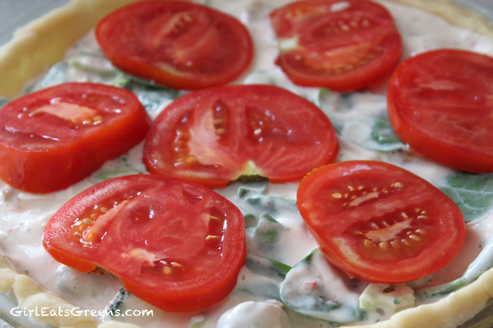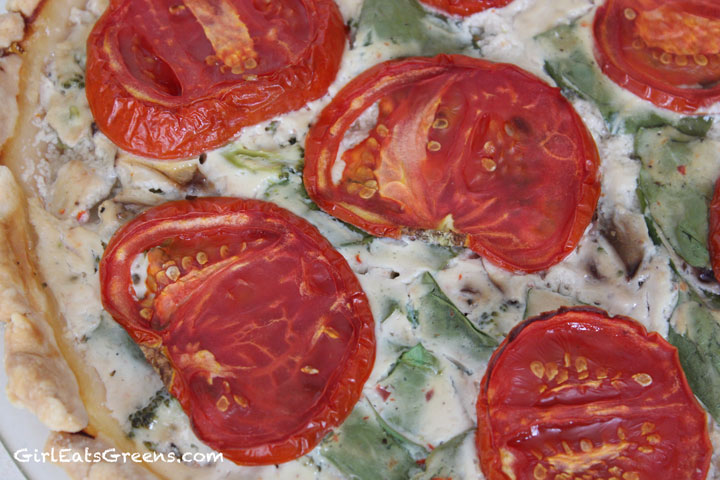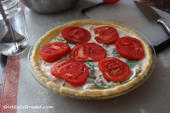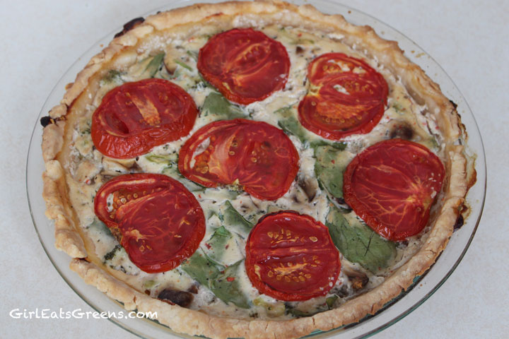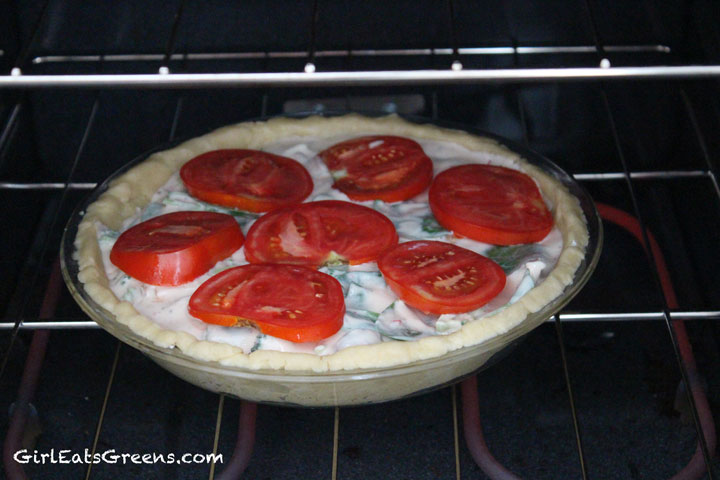 Then pour the insides into the crust and put the tomato slices on top. Place in the oven and bake for 45minutes to an hour, until the insides are bubbling and the crust is slightly browned. If you’d like to cut down on the baking time, you could pre-bake the crust and sautee the vegetables before mixing with the tofu and milk. I prefer to just toss everything into the oven and do other things while waiting.