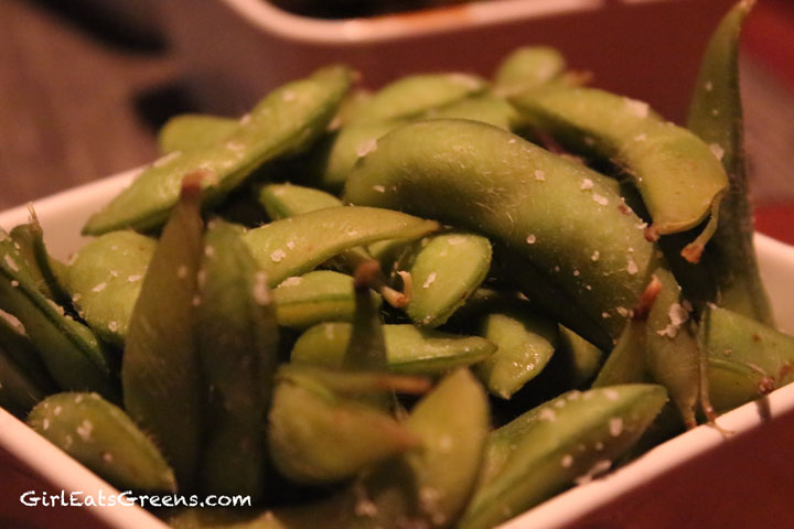 Sushi restaurants are always a safe bet for me, most any place can whip up an avocado roll for you. But this place had a really inventive vegetarian roll already on the menu. We started with edamame and of course champagne to celebrate.