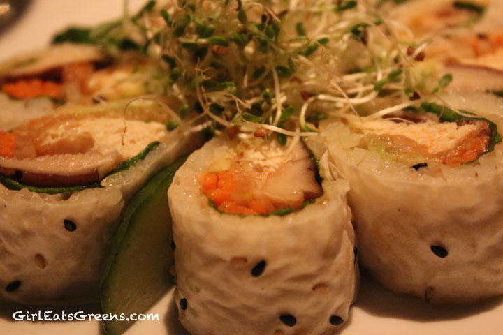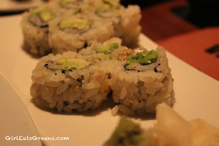 I went with the vegetarian roll – the Buddha Belly. It’s made with puffed tofu, shiitake, spicy bean sprouts, tatsoi, avocado, and smoked soy. It was not only delicious but so pretty! And of course I went with an avocado roll for good measure.