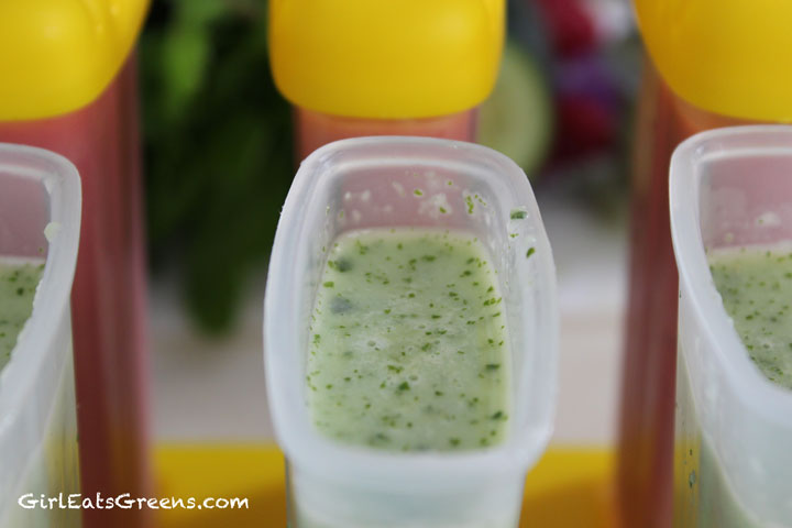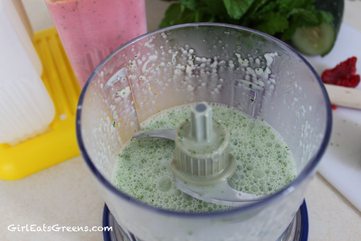 Rinse your blender out and add the remaining coconut milk, cucumber and mint. Blend until smooth and add to the three other molds. Put everything in the freezer and wait for it to set.