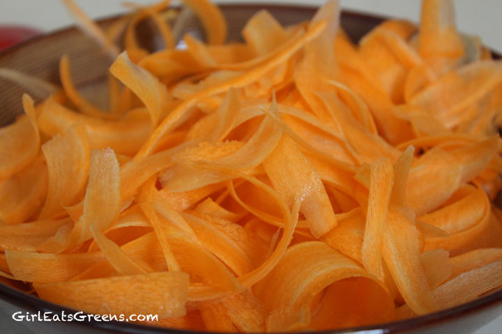 Start by pressing your tofu and bringing a pot of water to boil Cut up all the vegetables and either julienne the carrots or use your vegetable peeler to slice them very thin (almost like noodles).