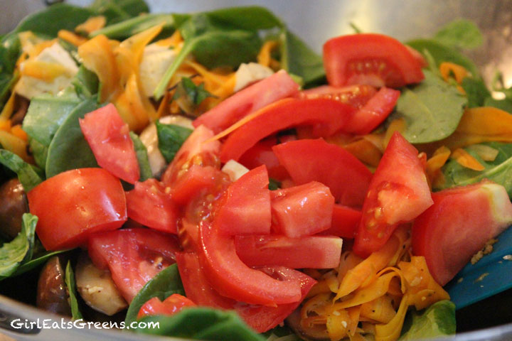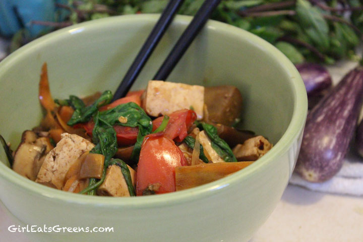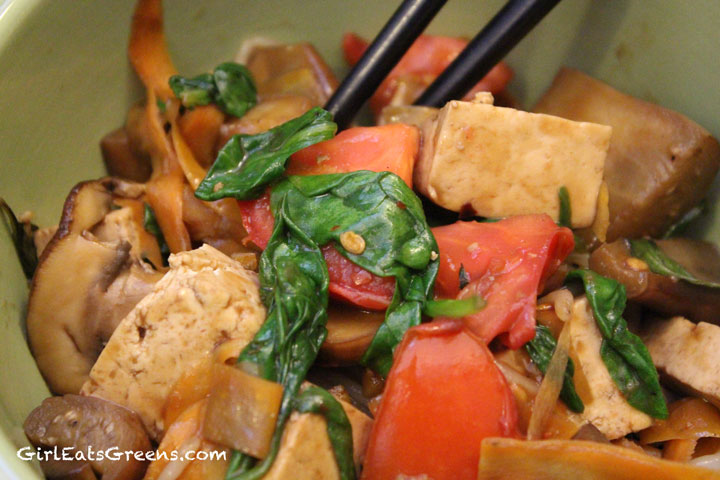Once the eggplant, mushrooms and carrots are cooked, add the spinach, basil, tomato and soy sauce. Add the cooked noodles to the wok and mix everything together. Add red pepper flakes and stir until everything is well combined.