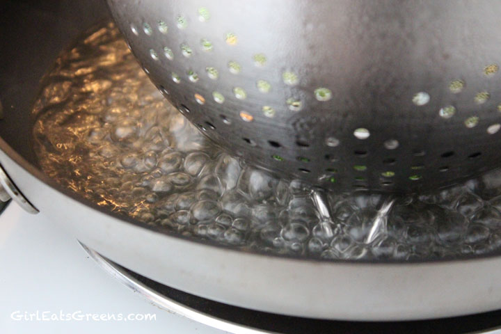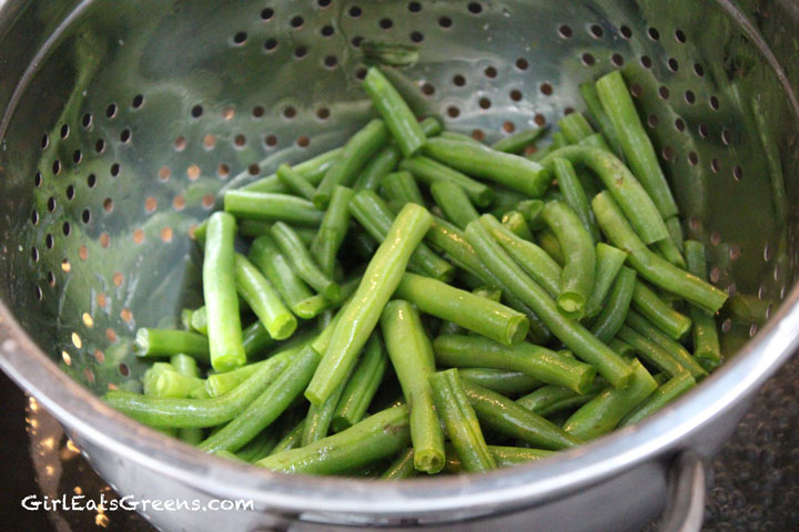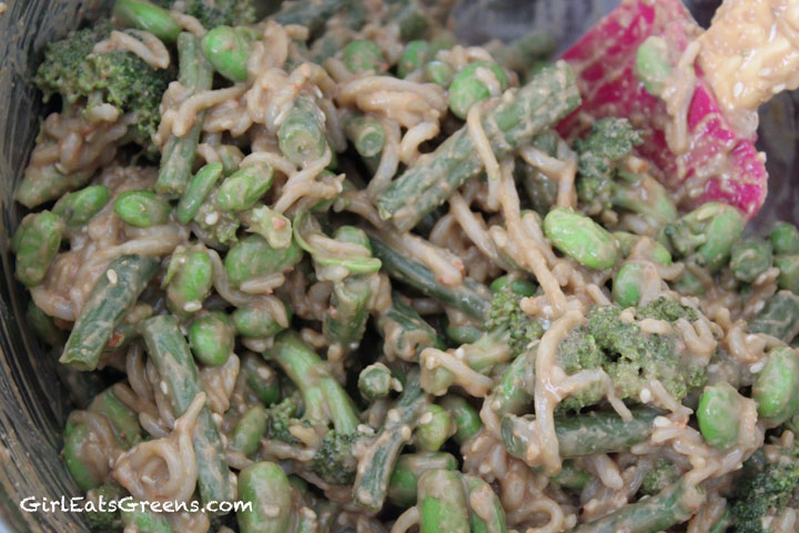 Trim and cut your green beans and steam those as well. They took a while longer than I thought they would – about 10-15 minutes. When cooked, set them aside with the broccoli and noodles, and add the edamame to the bunch.