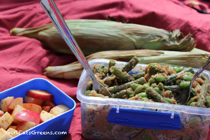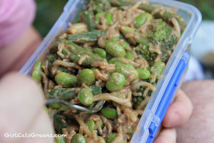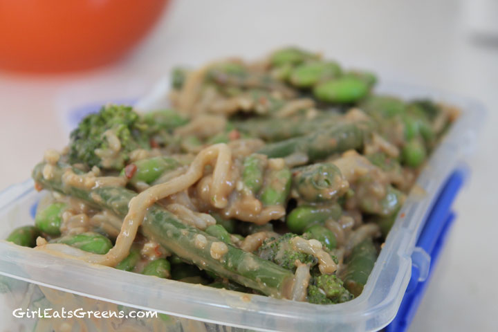 On a recent Sunday, R and Madison and I had a fantastic afternoon dinner in Central Park. I still had green beans and broccoli laying around from our CSA delivery and had some rice noodles (gluten-free!) I also needed to find some use for. So I decided instead of packing us a salad, I’d get a little more creative and come up with a way to use them all together. I had been dying to find another use for the peanut sauce from the Thai Peanut Salad I made a while back, so I figured this would be it. It was a perfect packable and shareable meal that was rich and creamy but still left us with no guilty feelings about eating it. And the leftovers were awesome at work the next day.