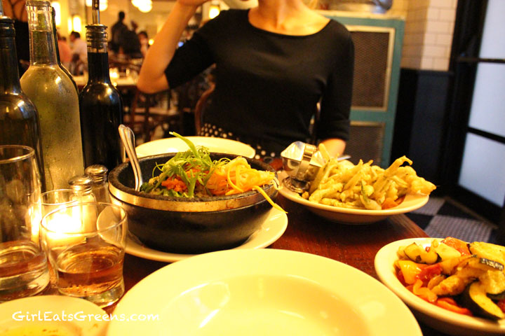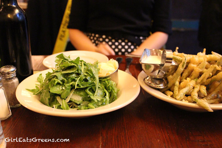 We decided to share, (as stated before, I’m a HUGE fan of sharing), but seeing as though my bridefriend is not vegan, we asked for all non-vegan additions on the side – starting with the baby arugula salad (parmesan on the side). There’s something just so simple and delicious about an arugula salad with fennel, lemon and olive oil that just hits the spot.