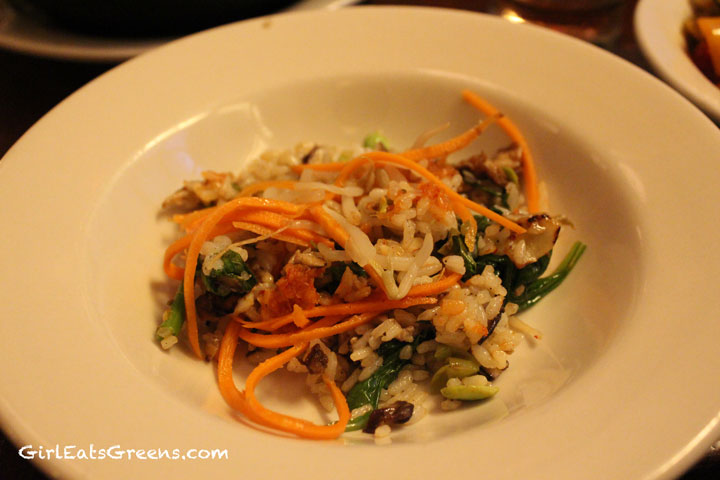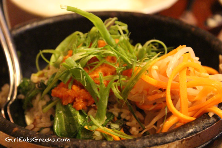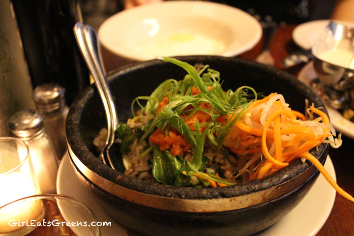 For the main course we went with their take on one of my Korean favorites, bibimbap. While completely different from the more traditional taste that I’m used to, this bibimbap held it’s own. I could have gone for more of a kick to it, but the veggies were good, it was hot, and they served the egg on the side, just like we asked. We also added a side of veggies -which were overkill. We ended up taking those home because we were too stuffed to finish everything.