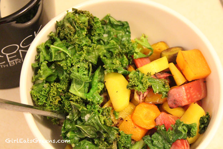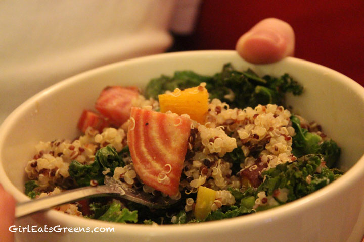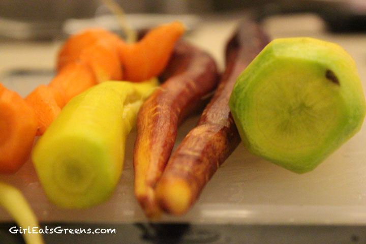 This was one of those recipes where I had no idea what to expect. It was Friday night after work, I didn’t have the energy to go out so I decided to make use of our most recent CSA delivery. Did you know carrots come in colors other than orange? I didn’t. And this delivery blew. my. mind. And the beets were all crazy colored too! I love cooking things that look like a rainbow, and with this meal we definitely got our fair share of color.