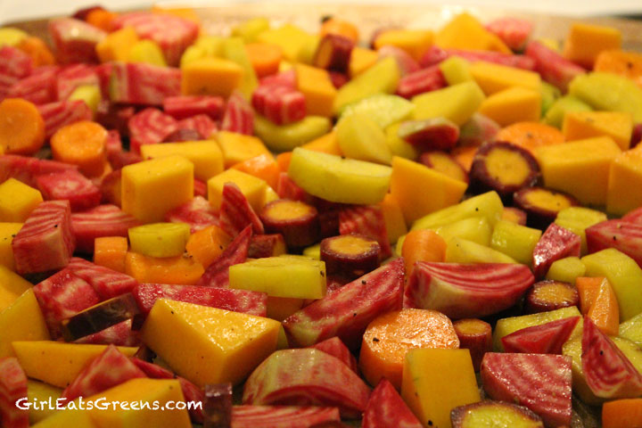 Preheat oven to 425. I started by washing and chopping all the veggies first. You’ll want to cut them down into bite-sized pieces but the shape is up to you. Put all the root veggies into a large bowl and top with one tablespoon of olive oil and a dash of pepper. Toss them around in the bowl until everything is coated. Place the veggies on a baking sheet and place in the oven for 15-20 minutes, or until they are easily pierced with a fork.