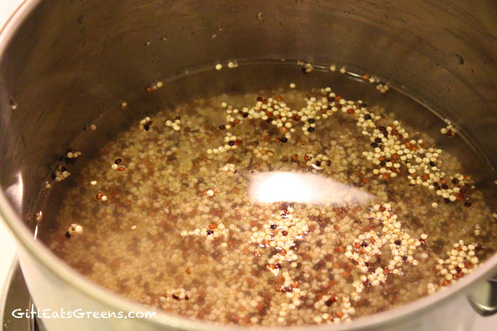 Then start on the quinoa. Make sure to rinse the quinoa. I didn’t quite know why people did this, but once I started doing it I noticed it made the quinoa much easier on my stomach. Maybe that’s why you rinse it? I’m still not entirely sure – but just do it. Place one cup quinoa with two cups water or vegetable broth into a small saucepan. Add one minced clove of garlic. (I didn’t have veggie broth laying around so I added the garlic to give it a little more flavor). Bring the water to a boil, and then cover and simmer until all the water is absorbed.