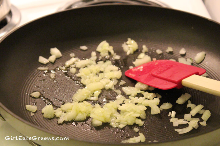 In another pan set at medium heat, add one tablespoon of olive oil with the chopped onion and garlic and cook until the onion begins to get translucent. Add the kale to the pan and turn down the heat a bit. You just want to wilt the kale a little, not fry it.