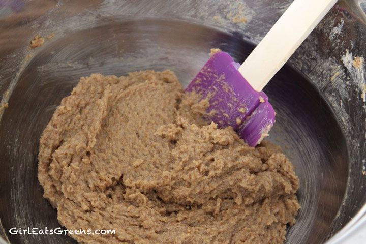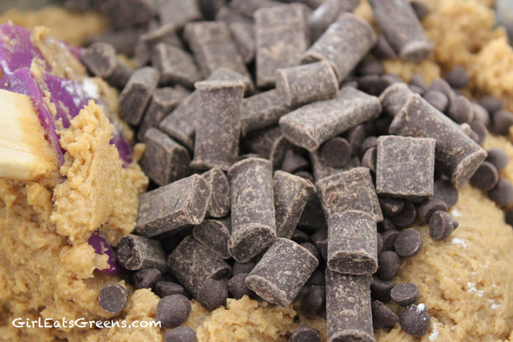 Add the shortening, margarine, sugar and vanilla together, beating until everything is well mixed together. (if you have a mixer use it! Otherwise get your arm workout in for the day like I did) At this point I would suggest adding the applesauce, but that’s not what I did. I didn’t decide to add the applesauce until after I added the flour and thought the batter was too dry. In any case, add the dry ingredients to the wet, and mix well. Once everything is mixed together, add the chocolate chips and chunks and give it another good swirl.