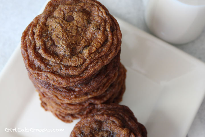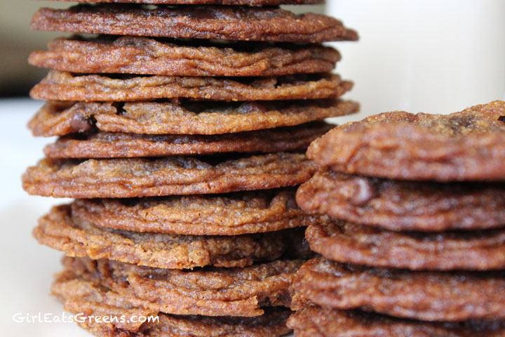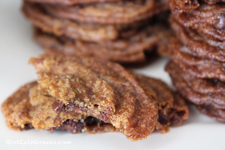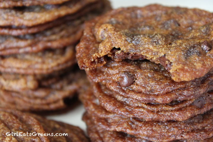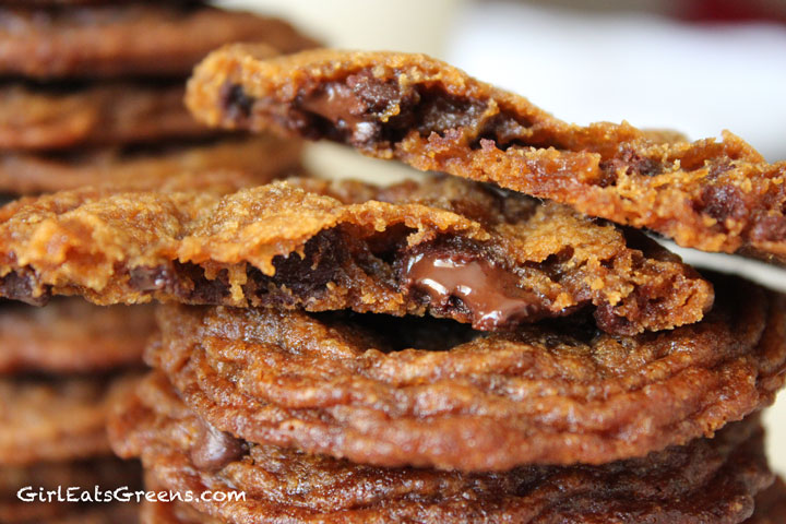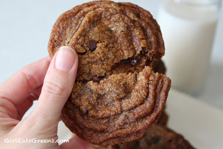 I did it! For those of you who saw my post last week about trying to recreate my mom’s delicious chewy chocolate chip cookies, this week I finally triumphed. I literally did a little dance in my kitchen when I tasted the first one and it was just like mom’s. I was actually very surprised they turned out at all – this was again a trial and error process and half the batch ended up not photograph-worthy, I ran out of all-purpose flour and earth balance vegan margarine, and my grocery store only had fair-trade organic brown sugar in the dark variety. So I was about to throw in the towel. But I powered through, substituting here and there and ended up with delicious (although darker than mom’s) chocolate chip/chunk cookies.