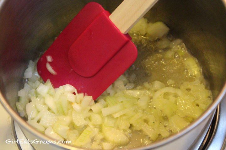 Add Earth Balance, onion and garlic to a sauce pan over medium heat and cook until onions are translucent. (if you have a larger soup pot, use it. I don’t have one, and made due with a small sauce pan). While you’re cooking the onions, go ahead and chop the potatoes.