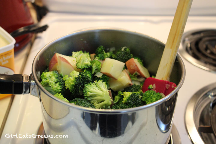 Add the potatoes to the pot and while they’re cooking, chop the broccoli and then add that to the pot. Add the vegetable broth and bring to a boil. Once the pot begins to boil, reduce the heat and cover – you want to make sure the potatoes are nice and cooked before moving to the next step. Add the cayenne and pepper and stir well.