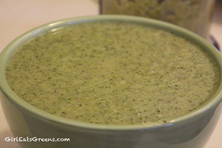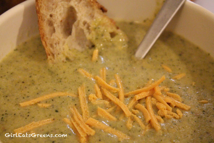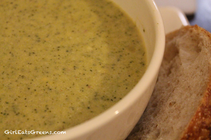 There was a cafe near campus where I went to college that had the most amazing broccoli cheddar soup served in a crusty sourdough bread bowl. Now that it’s getting cold, all I want is warm comfort food. After my craziness at work ended this week, I went home early last night, and decided to try my hand at my own broccoli “cheddar” soup in a bread bowl. After searching far and wide for a round sourdough loaf that I could make into a bowl, I gave up. And instead just went with slices of bread that I then soaked into the soup. Either way, this ended up being exactly what I was craving. I was especially impressed with the cheesy flavor of the soup and went back for multiple servings. Add a nice glass of red wine and you’ve got comfort all the way.