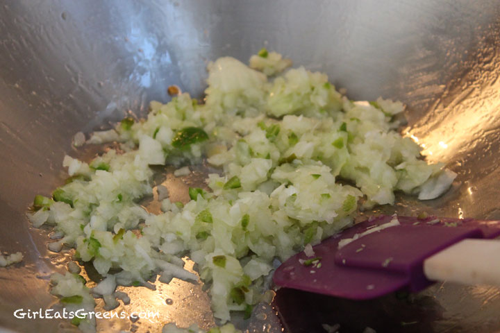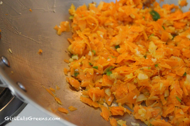 Preheat the oven to 350 degrees. Start by chopping all your vegetables. I opted to throw everything (except the carrot) into the kitchen ninja – quick and easy. For the carrot, I used a vegetable peeler to create thin strings. It would have been easier and probably the same result had I just put it in the ninja. But I started with the carrot… so there you go. When everything is chopped, set aside.