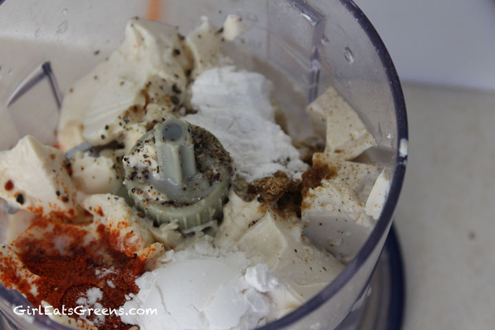 Add the tofu, milk, spices, lemon juice, flour, and nutritional yeast to a blender or ninja and blend until smooth.