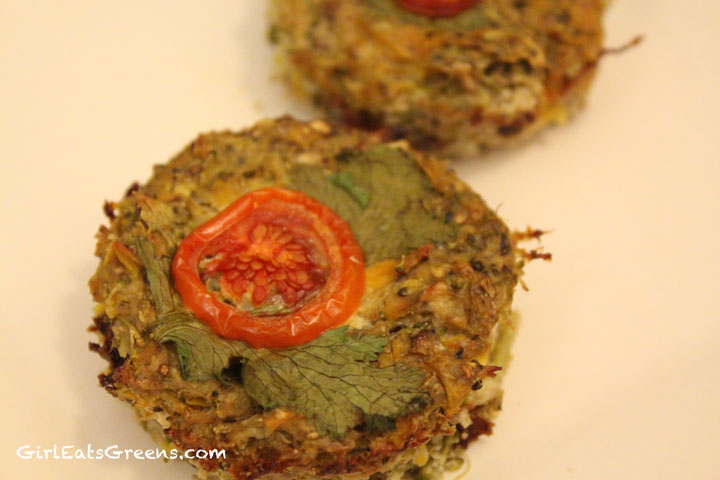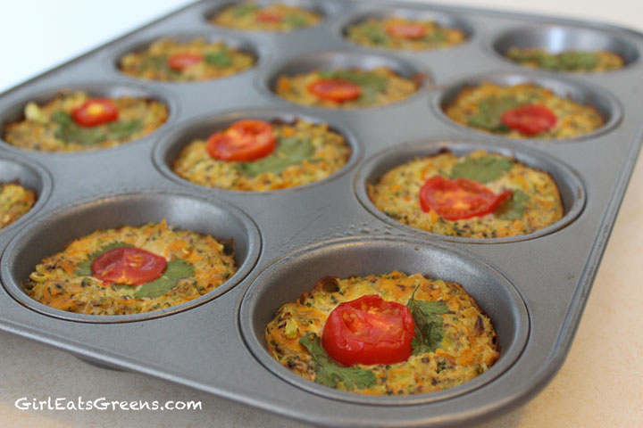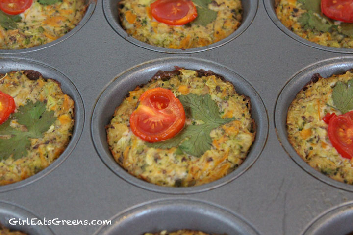 In a large bowl, (or wok if you’re using), add all the ingredients together and stir until the all the vegetables are coated with the tofu mixture. Grease cupcake tins (I used a spray coconut oil from Trader Joe’s) and fill the cups until all the batter is evenly distributed. Top with a leaf of cilantro and sliced tomato.