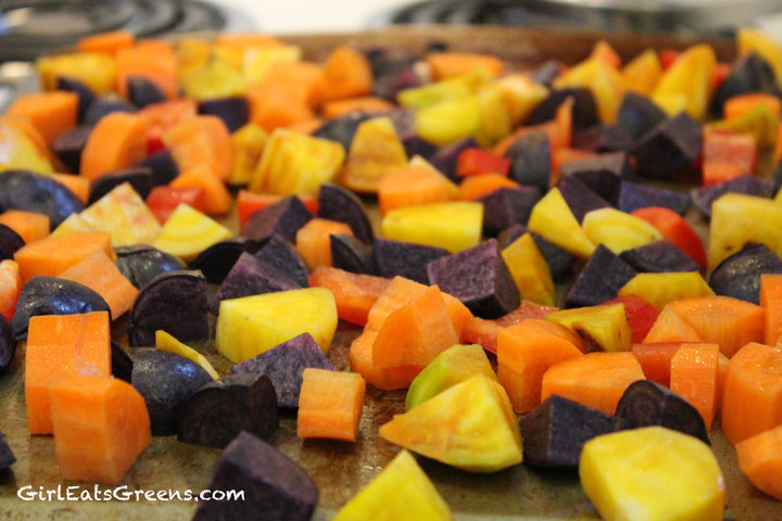 Preheat the oven to 425 and start by chopping all your vegetables and tossing them in a little olive oil. Leave half of the red pepper unchopped, to reserve for the hummus. Place everything – except the kale – on a baking sheet and bake for about 12 minutes, or until veggies are starting to get soft.