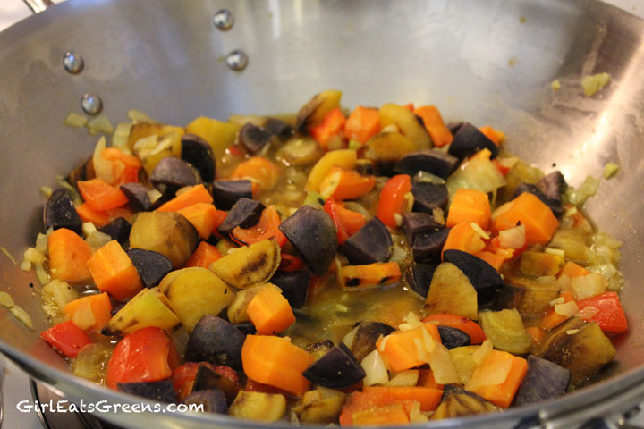 In a large skillet or wok with a cover, saute the onion and garlic in a tablespoon of olive oil. When onions start to get translucent, add the other spices and vegetable broth. By this time your vegetables should be close to softening. Take them out of the oven and add to the wok, stirring to make sure everything is coated. Cover, and let the vegetables simmer in the broth while you make the hummus.