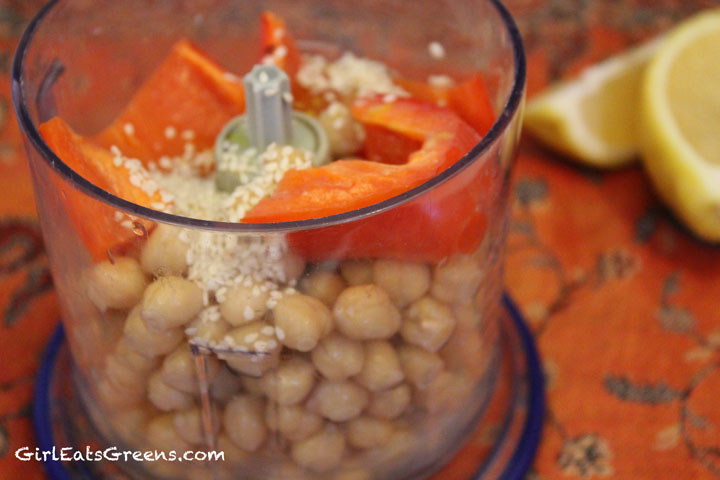 I’ve also been really into roasted red peppers lately, after figuring out they’re ridiculously easy to make. I figured, if I could roast a pepper, I could make a roasted red pepper hummus and save myself from the store-bought version with strange ingredients that I’m not quite sure what they are. See what happens when I’m left home alone? Epic cooking experiments.