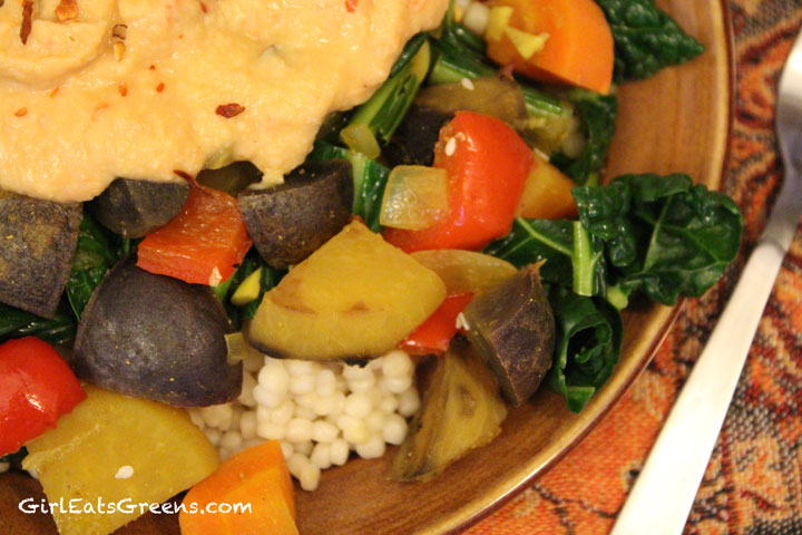 Serve the vegetables over the couscous and top with hummus and a little red pepper flakes for garnish. This was a surprisingly filling dinner and it was a perfect way to warm up after a cold day. And I bet it’s going to be even better as a leftover for lunch today when all the flavors have had even more time to meld.