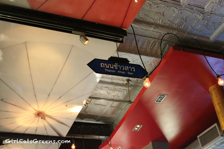 The first thing that I loved about the restaurant was its attention to detail in the decorating process. From the red umbrellas to the giant photographs on the wall, to the street signs and golden bells- everything is in line with the Thai motif. Even down to the menu which looked like a newspaper.