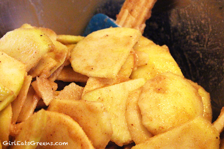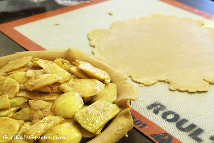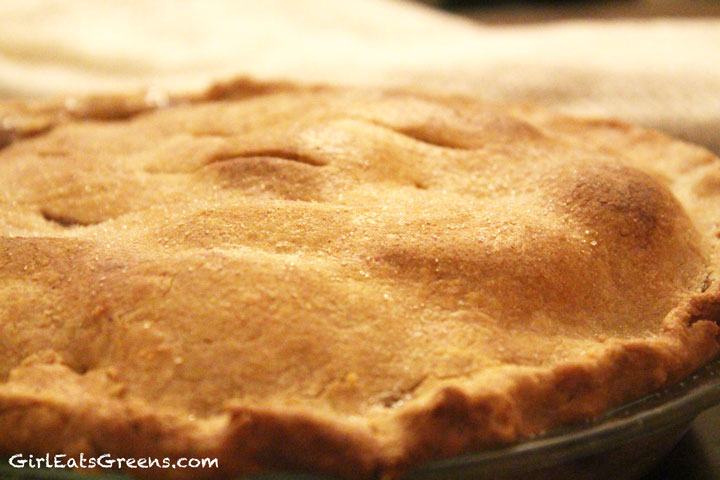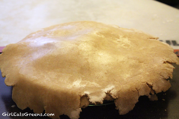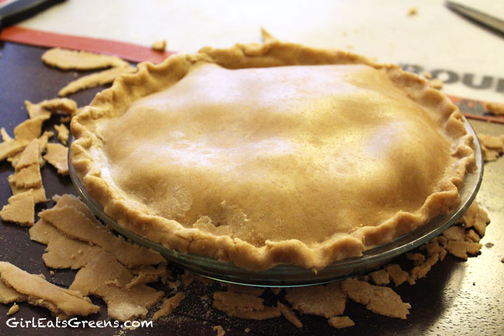 When I offered to make pies for Thanksgiving, I went back and looked at my mom’s recipe, hoping it would be easy to turn vegan. But upon further inspection, not a bit of butter or dairy listed in the recipe. I was so excited – making one pie I already know how to make and one new one is much less intimidating than trying to bust out two new recipes to wow the Thanksgiving crowd. Of course when shopping I decided to throw myself a curve ball and pick up whole wheat flour instead of white – because why not make the pies as healthy as possible? This made for an interesting wrestling match between me, the dough, and the rolling pin. I eventually came up with the genius idea to roll the crust out with cling wrap over top – an invention I wish I had figured out years ago!