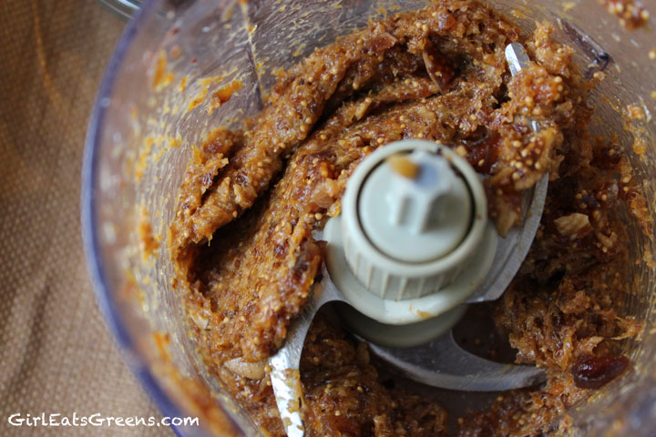 Next, take the figs and apricots and process them until smooth. Add the melted coconut oil and process again until everything is well incorporated. Depending on how dry the mixture is, you could add a bit more oil or a tablespoon of warm water if needed.