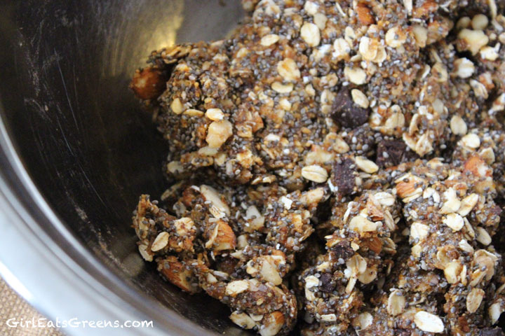 Then, add all the ingredients together in a large bowl. Mix everything until it begins to stick together and you’ve evenly distributed all the ingredients.