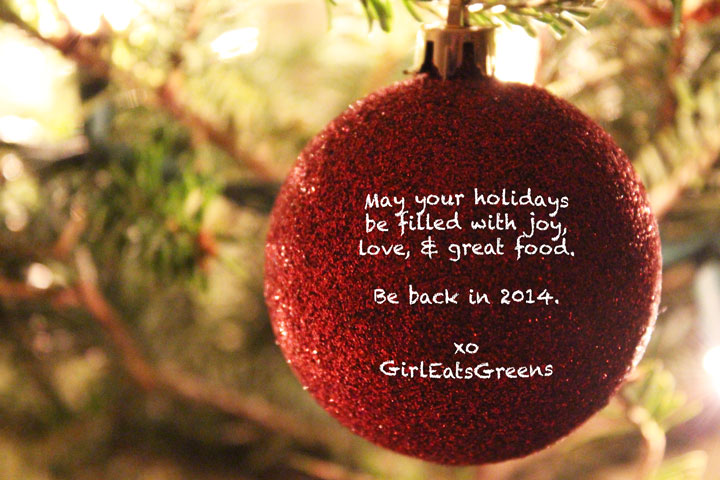 Happy Holidays & Hiatus December 23, 2013 · by GirlEatsGreens · in Personal. · Like it? Share it! Click to email a link to a friend (Opens in new window) Email Click to share on X (Opens in new window) X Click to share on Facebook (Opens in new window) Facebook Click to share on Pinterest (Opens in new window) Pinterest Click to share on Pocket (Opens in new window) Pocket Like Loading... Related
