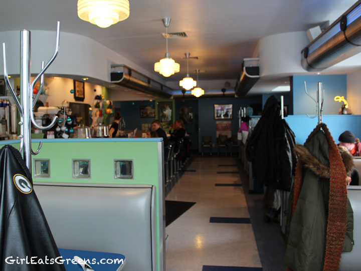 But boy, was I wrong. This diner was your average diner in terms of decor – the straight out of the 50s looks – but the menu was something completely unexpected. Not only did they have the entire thing labeled (V for vegan, gluten-free, vegetarian, etc.) but there were multiple, multiple vegan choices!
