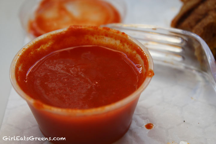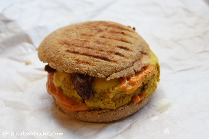 I ordered the “egg” “sausage” and “cheeses” on an English muffin with a side of hot sauce. As far as fake everything goes – this was pretty delicious. Especially when slathered in hot sauce. There was a vegan hollandaise sauce too, but it didn’t have a ton of flavor. The tofu was a bit bland, but the cheese and the sausage was good. It definitely hit the spot. (again – add hot sauce!)