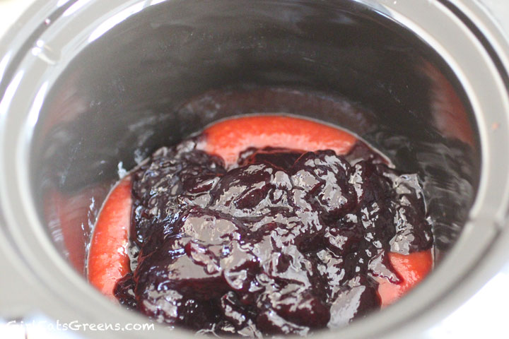Once everything is mixed together, form the mixture into balls about one inch or so in diameter. Add the jelly and cocktail sauce in a slow cooker on low.