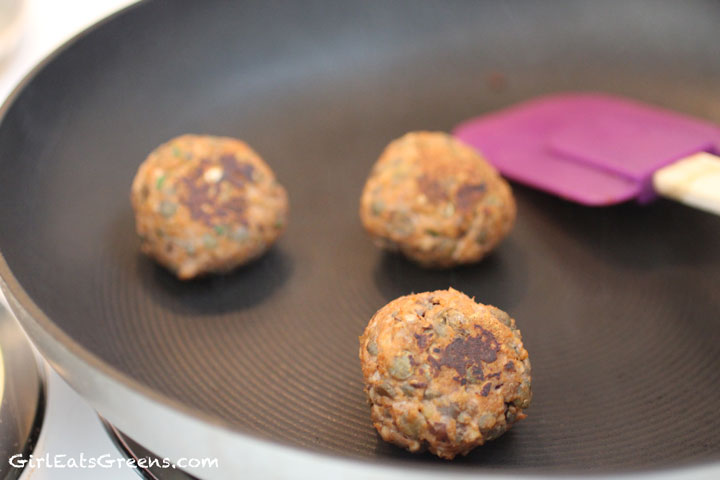 Heat a small amount of oil over medium high heat in a skillet. Add the meatballs in small batches so you can really pay attention to them. Turn them frequently until they’re browned on all sides and cooked through (about 6 minutes).