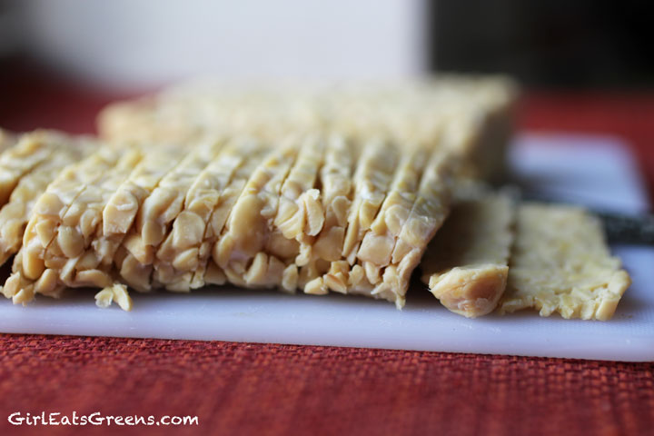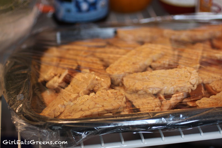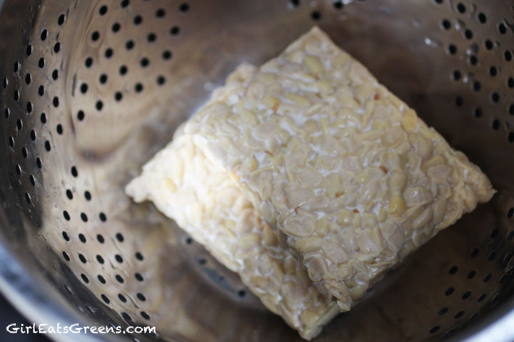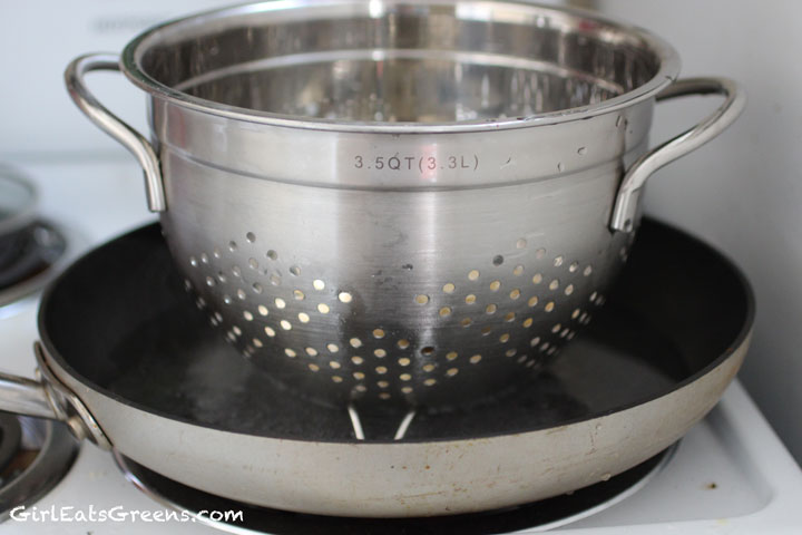 If you’re like me, and find tempeh to be bitter at times, start by steaming the tempeh for about 10 minutes. This doesn’t have to be a fancy process. I used a pan and a metal strainer.