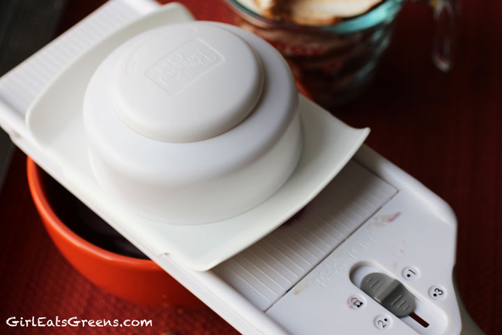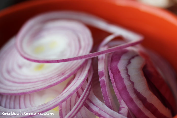 IMG_3628 IMG_3629While the tempeh is steaming, go ahead and slice the mushrooms and onions. I was super excited to break out a new kitchen tool for this.  My mom got me this amazing slicer for Christmas and it was perfect for this scenario. If you don’t have a fancy gadget, just try to slice the onion as thin as you can.