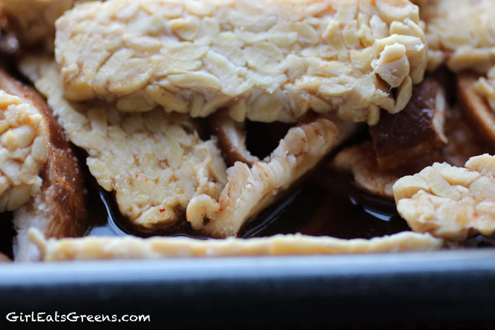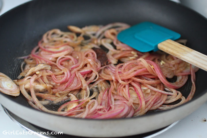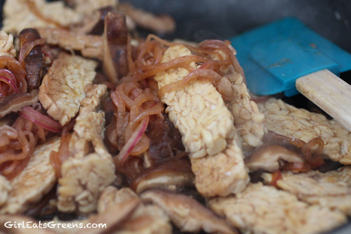 The next morning, separate out the onions and mushrooms, and cook them a bit over medium heat in a greased skillet. You’ll want the onions to be fully cooked to cut some of their strong flavor and let them get a little caramelized. Add the tempeh at the end for a little searing action.