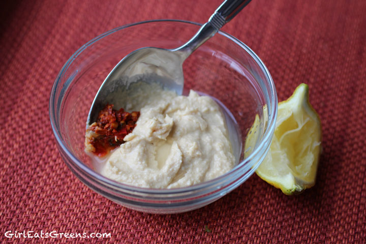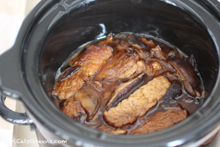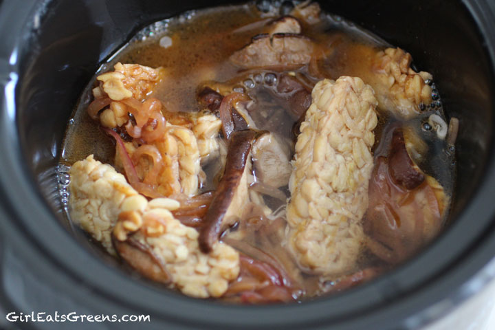 Then add the marinade, tempeh, mushrooms and onions to a slow cooker on low. Add one cup of water and cover. Let the mixture simmer for 4-5 hours. When you’re ready to eat, mix the hummus, harissa, and lemon juice for a spicy sauce for the sandwich.