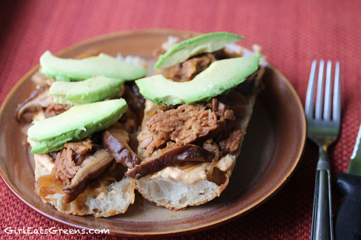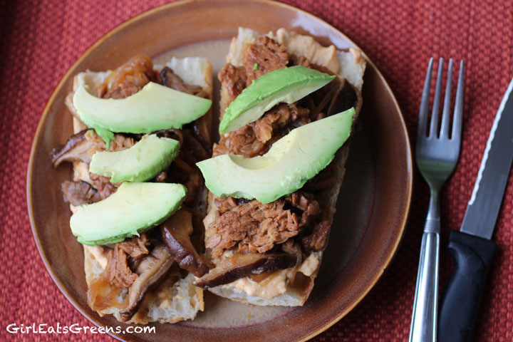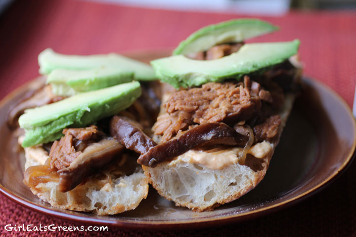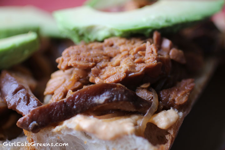 Slather the hummus on crusty bread, top with onions, mushrooms and tempeh and sliced avocado. I served the sandwich open-faced because it was so huge. This sandwich was definitely a hit with R. It is pretty manly. Or just made for a large appetite. It wasn’t quite the same as Monty’s but will definitely find a place in our regular rotation. And I could see serving this to non-vegans and having it go over quite well.