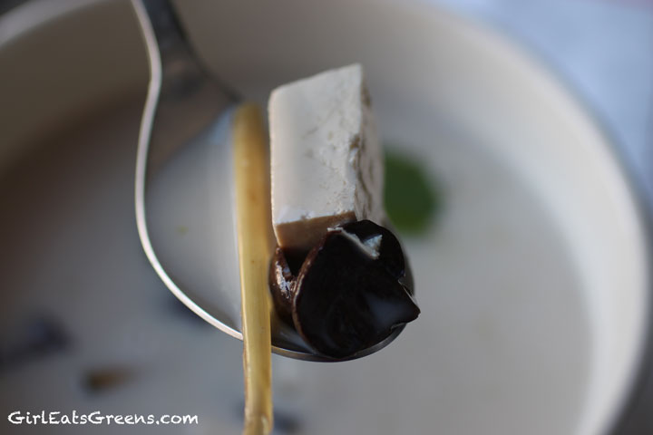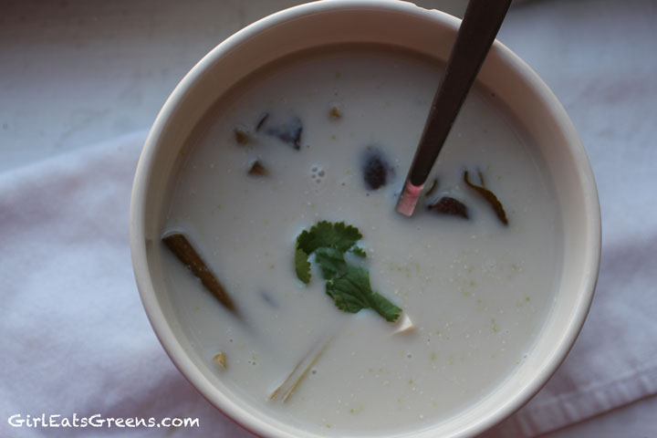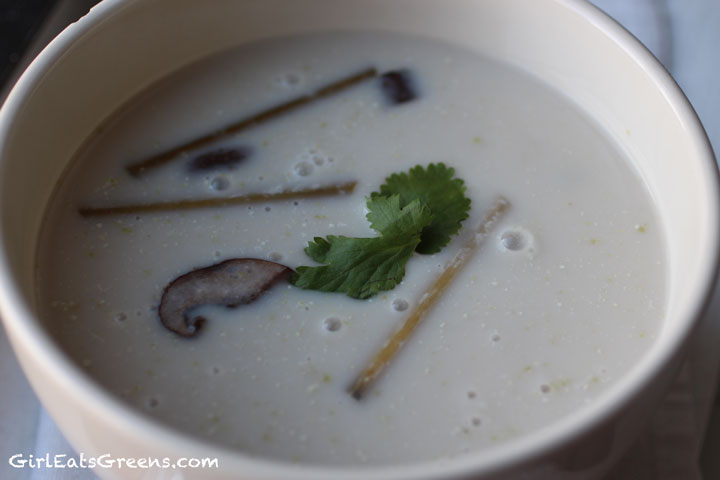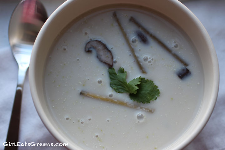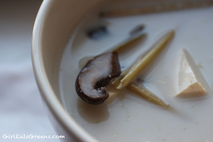 Just when I was starting to think spring was on the way, we got hit with another batch of snow. Sigh. Even though I’m completely over winter, and mostly over comfort foods of winter, I couldn’t help but feel the need for a soup for dinner the other night. And maybe it’s just all of our Southeast Asia trip planning or the at least once a week trip or takeout from our favorite Thai restaurant, but I have been in a serious Thai mood lately. There is one soup in particular I used to love in my pre-vegan days. Tom Kha Gai soup is coconut milk based and usually features chicken and mushrooms. It used to be one of my favorite orders and I haven’t had it in years. While grocery shopping I stumbled upon some fresh lemongrass and kaffir lime leaves, and was instantly inspired. So I decided to try my hand at my own veganized Tom Kha Gai soup.